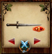 Na začátku naší knihy má u sebe krátký mečík, který v rychlosti strhla ze zdi a ten ji v soubojích přidává k síle +1. V okénku vpravo nahoře je její zbraň vyobrazena. Dvě červené šipky pak umožňují čtenáři vybrat ze všech zbraní, které se v našem příběhu mohou vyskytnout vždy tu, kterou má Josefina u sebe a kterou používá. Hodnota nebo hodnoty u ní uvedené se pak v souboji přičítají k základním hodnotám síly (červené číslo) nebo vůle (modré číslo) naší hrdinky.